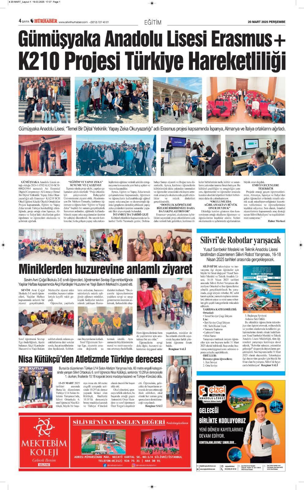 We wrote an article about AI and Education Türkiye Mobility to the local press. https://www.silivrihurhaber.com/gumusyaka-anadolu-lisesi-erasmus-k210-projesi-turkiye-hareketliligi-102684.html Navigazione articoli Türkiye: AI and EducationErasmus+ Corner Colegio San Buenaventura