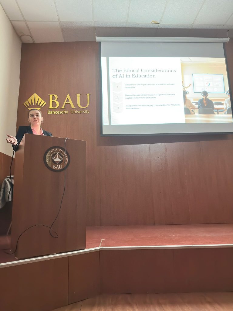 Within the scope of the project activities, we visited Bahçeşehir University, where Dr. Meltem Özmutlu, an academician, delivered a presentation on “Education and Artificial Intelligence” to the participating teachers and students. Following the presentation, a workshop on AI applications in education was conducted. Through this experience, participants gained new perspectives and a vision for the effective integration of rapidly evolving AI technologies into education.